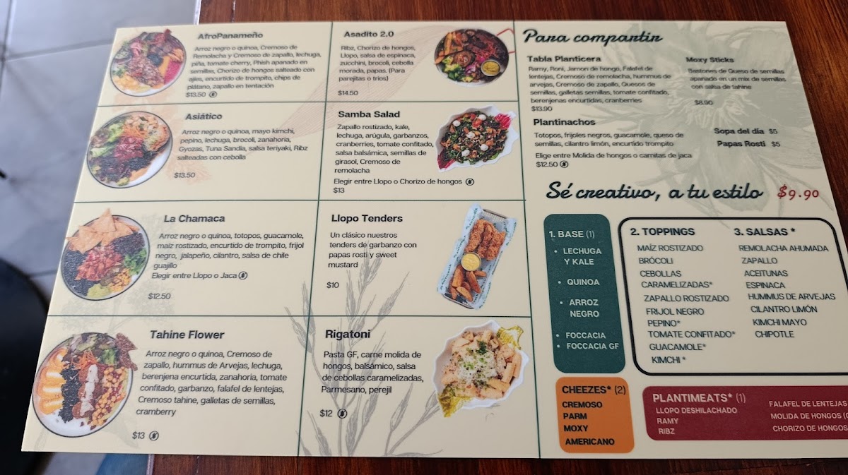 For those looking to share, the “Para Compartir” section reinforces the restaurant’s social and welcoming spirit. The TABLA PLANTICERIA, MOXY STICKS GF, and PLANTINACHOS (CON OPCION GF) are clearly designed for the center of the table, encouraging conversation and communal enjoyment. These dishes also showcase how plant-based food can be playful, comforting, and perfect for group dining.